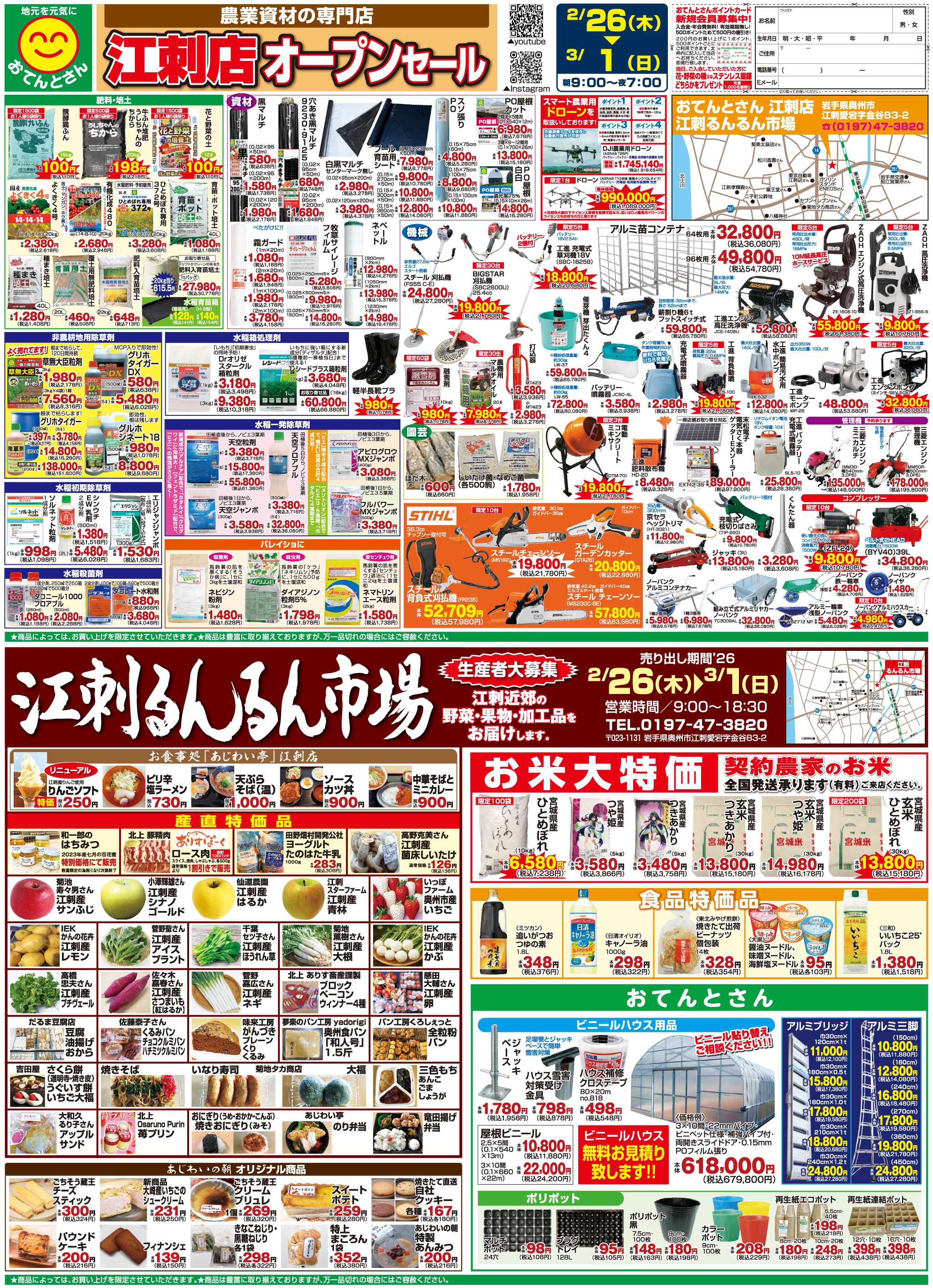 - 2/26(木)午前9:00 敷地内に「農業資材店 おてんとさん」オープン!NEW